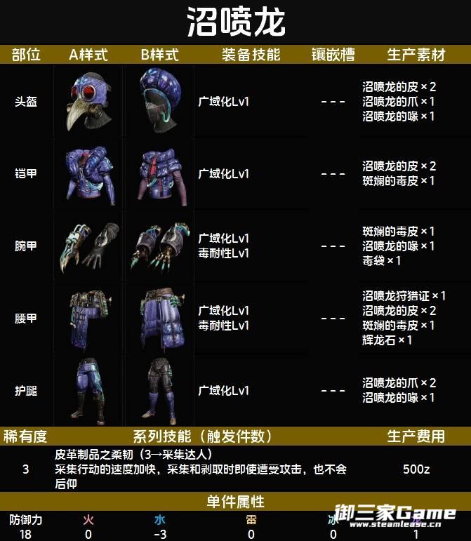 沼喷龙是《怪物猎人荒野》中的一只原创怪,那么其下位套装有什么技能,需要哪些制作材料呢?下面为大家带来《怪物猎人荒野》下位沼喷龙套装图鉴,希望对大家有用。