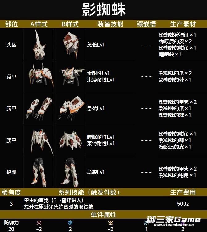 《怪物猎人荒野》中的影蜘蛛也是一只经典的回归怪,其下位的套装一一套稀有度3的防具。下面为大家带来《怪物猎人荒野》下位影蜘蛛套装图鉴,希望对大家有用。