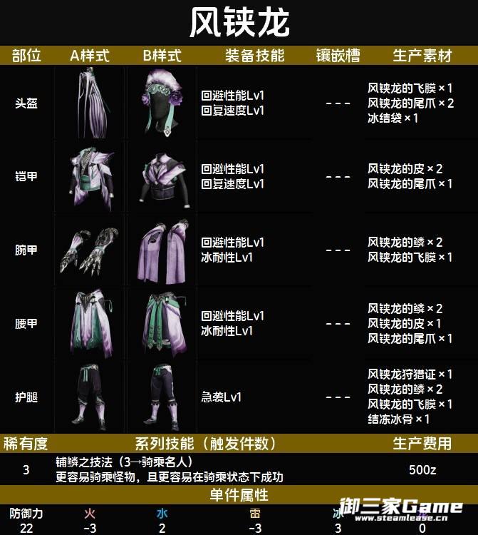 风铗龙是《怪物猎人荒野》中的原创怪之一,它的下位防具是一套稀有度3的装备。下面为大家带来《怪物猎人荒野》下位风铗龙套装图鉴,希望对大家有用。