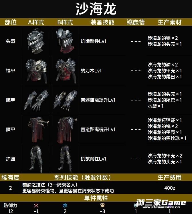 《怪物猎人荒野》的沙海龙在下位前期就能遇到,那么它的下位套装有什么技能,需要什么材料制作呢?下面为大家带来《怪物猎人荒野》下位沙海龙套装图鉴,希望对大家有用。