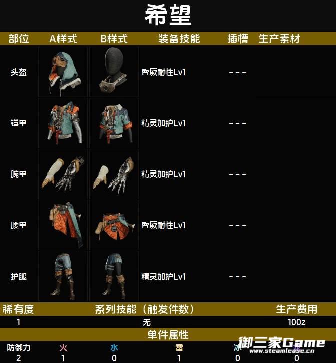 《怪物猎人荒野》中的希望套是下位的装备,拥有两种款式,那么希望套是什么样子,装备有着什么技能。下面为大家带来《怪物猎人荒野》下位希望套装图鉴,希望对大家有用。