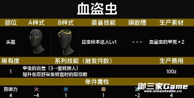 《怪物猎人荒野》的血盗虫装备是一件下位防具,只有头盔部分,那么血盗虫装备有什么技能,又要哪些材料制作呢?下面为大家带来《怪物猎人荒野》下位血盗虫装备图鉴,一起来看看吧。