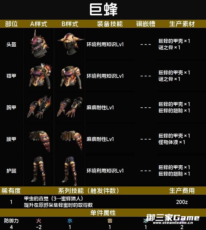 《怪物猎人荒野》下位巨蜂套有五件装备,那么巨蜂套有哪些技能,又需要哪些制作素材呢?下面为大家带来《怪物猎人荒野》下位巨蜂套装图鉴,希望对大家有用。