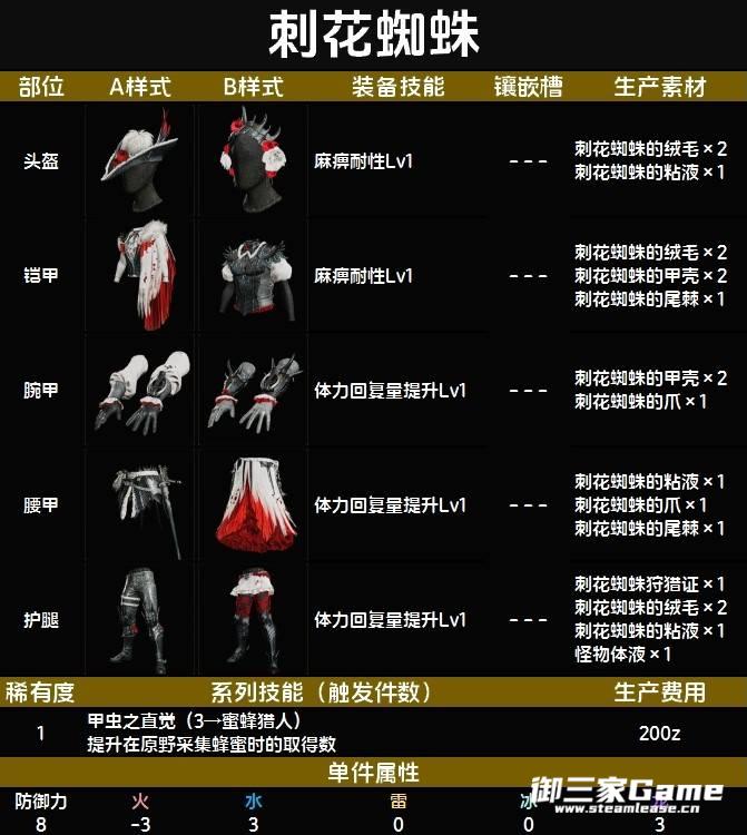 《怪物猎人荒野》的刺花蜘蛛是一只大型怪,那么下位的刺花蜘蛛套装有什么技能,需要什么材料制作呢?下面为大家带来《怪物猎人荒野》下位刺花蜘蛛套装图鉴,希望对大家有用。