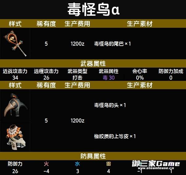 《怪物猎人荒野》中随从猫的毒怪鸟α套装是一套稀有度5的防具,下面为大家带来《怪物猎人荒野》随从猫毒怪鸟α套装图鉴,包含套装数据与制作材料,一起来看看吧。