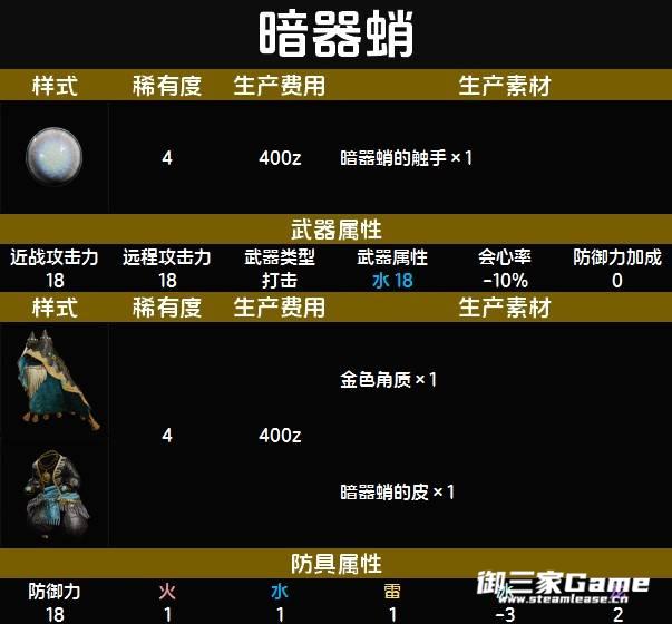 《怪物猎人荒野》中随从猫的暗器蛸套装是一套稀有度4的防具,下面为大家带来《怪物猎人荒野》随从猫暗器蛸套装图鉴,包含套装数据与制作材料,一起来看看吧。