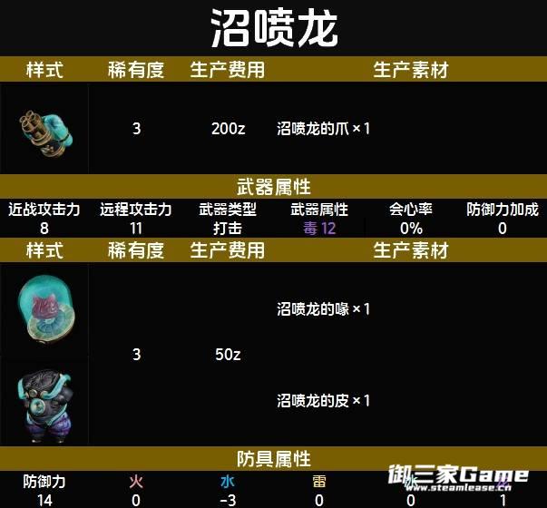 《怪物猎人荒野》中随从猫的沼喷龙套装是一套稀有度3的防具,下面为大家带来《怪物猎人荒野》随从猫沼喷龙套装图鉴,包含套装数据与制作材料,一起来看看吧。