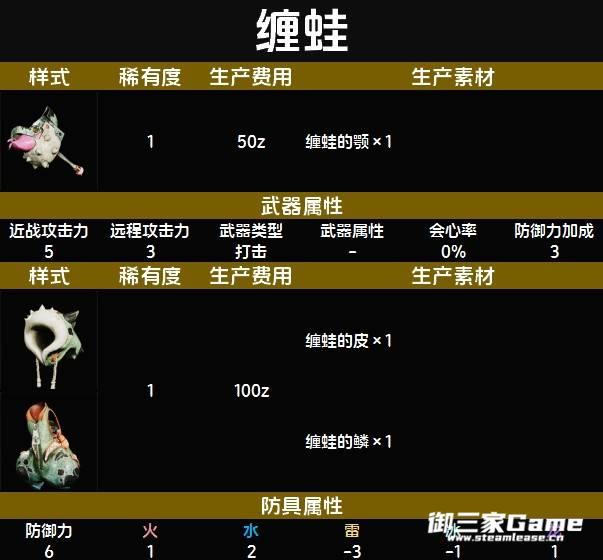 《怪物猎人荒野》中随从猫的缠蛙套装是一套稀有度1的防具,下面为大家带来《怪物猎人荒野》随从猫缠蛙套装图鉴,包含套装数据与制作材料,希望对大家有用。