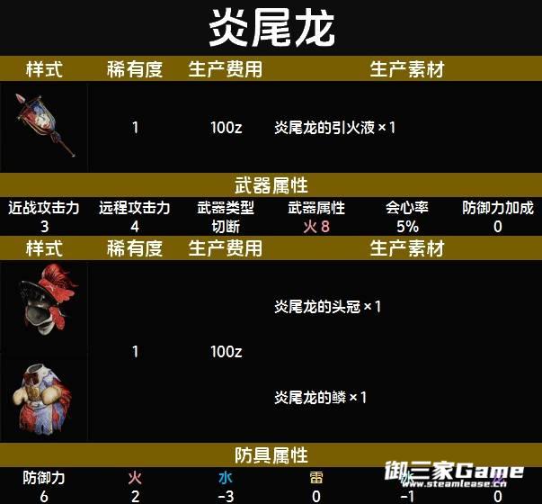 《怪物猎人荒野》中随从猫的炎尾龙套装是一套稀有度1的防具,下面为大家带来《怪物猎人荒野》随从猫炎尾龙套装图鉴,包含套装数据与制作材料,希望对大家有用。