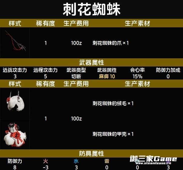 《怪物猎人荒野》中随从猫的刺花蜘蛛套装是一套稀有度1的防具,下面为大家带来《怪物猎人荒野》随从猫刺花蜘蛛套装图鉴,包含套装数据与制作材料,希望对大家有用。