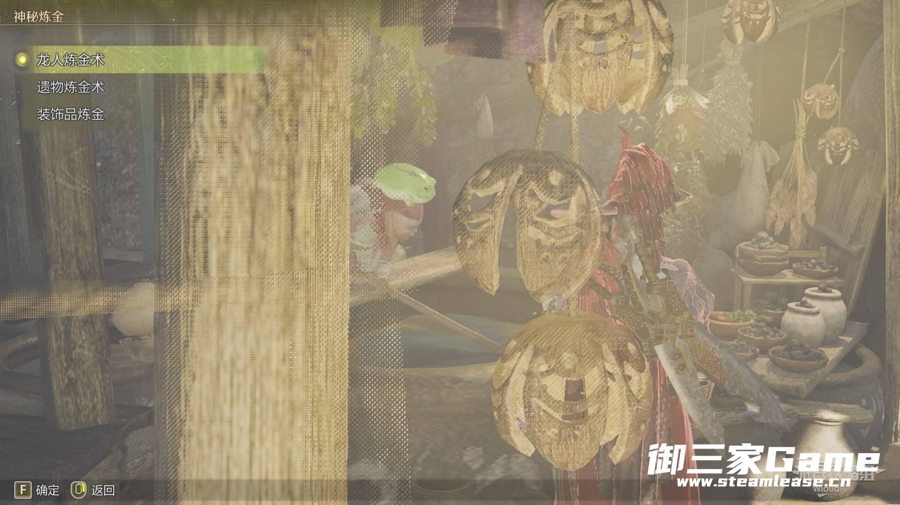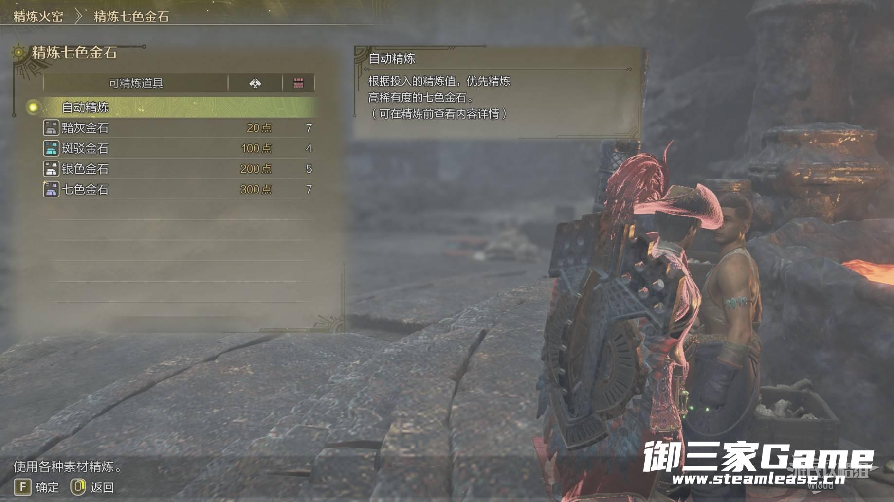 只会出现在涌油古的大本营,与图标所示位置的NPC对话可以将怪物素材花钱精炼成各种金石。