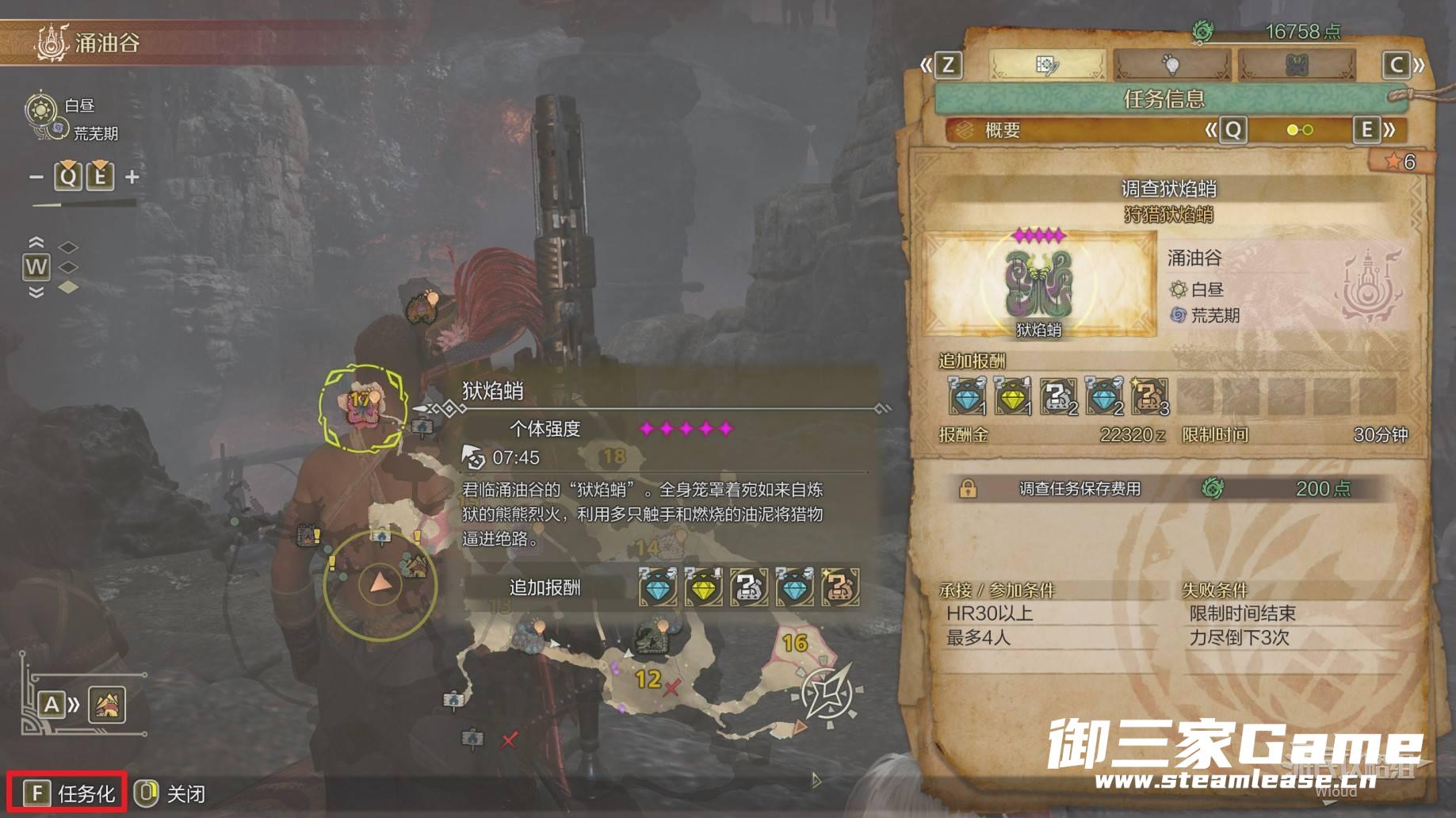 每张地图外面都有大量四处游荡的野生怪物,这些怪物与任何任务都没有关系,点击地图上显示的怪物图标,屏幕左下角会出现【任务化】这一选项,跟随提示按下相应按键即可将这只怪物转化为一个【实地调查任务】。