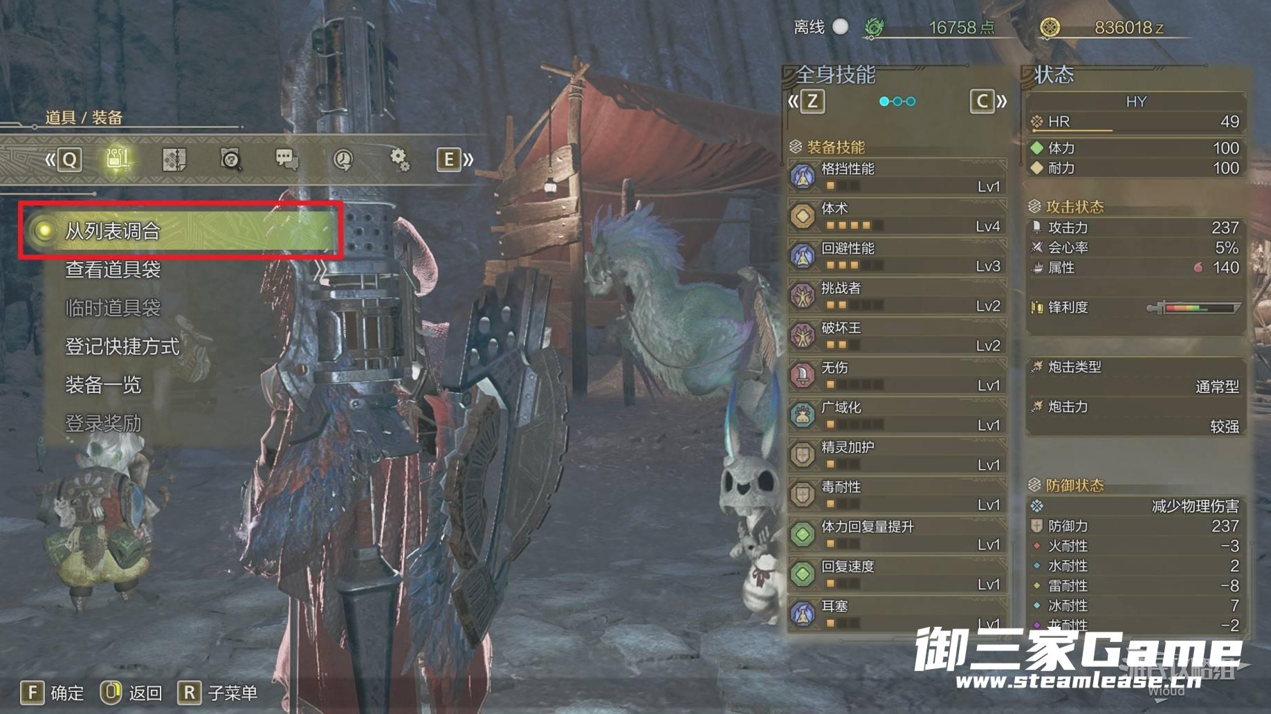 主页面打开设置菜单,第一页【道具/装备】选择【从列表调和】即可通过收集而来的素材调和大量道具。