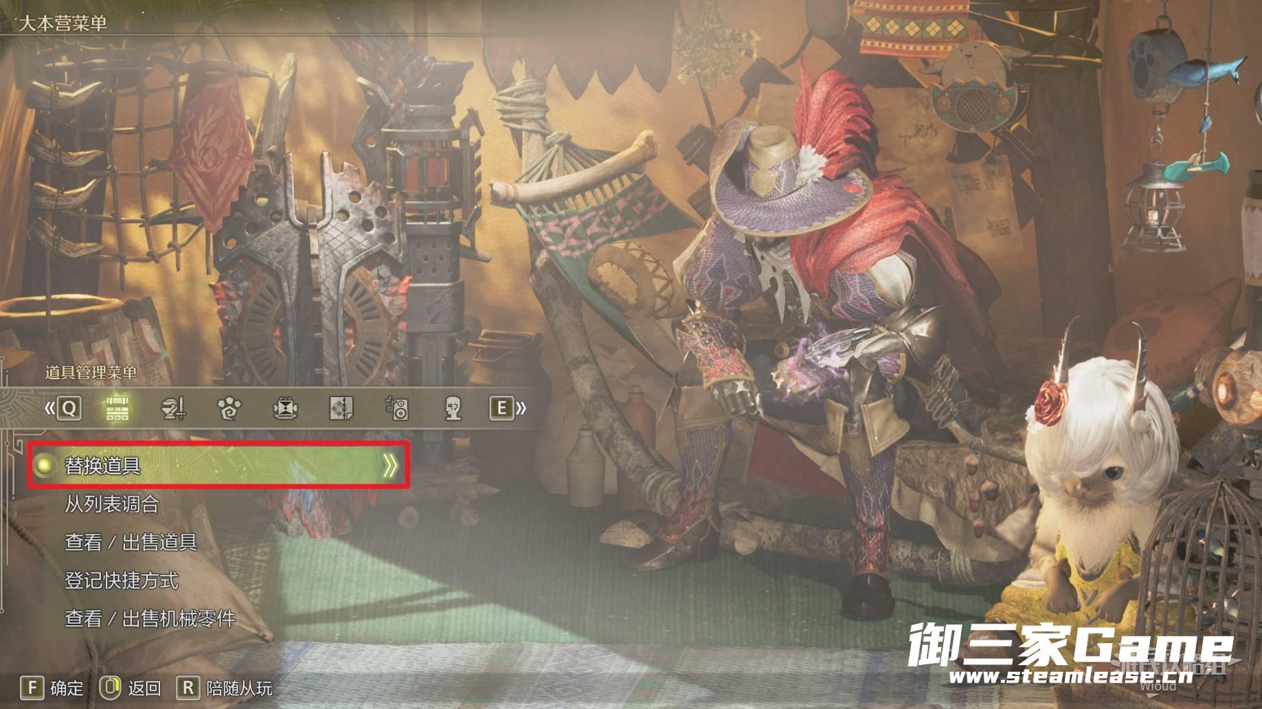 玩家需要前往任意营地的个人帐篷中,第一个【道具管理菜单】选择【替换道具】。
