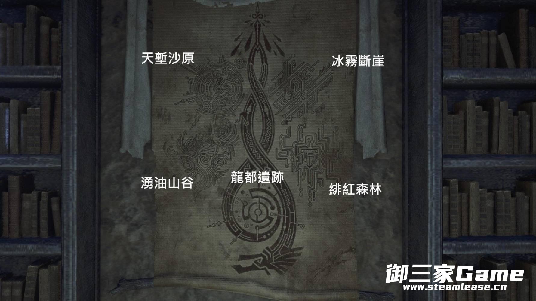 在龙都图书馆中,可以看到5个环代表着5个实际地址,分别为(左下)涌油山谷(左上)天堑沙原(右上)冰雾断崖(右下)绯红森林以及(下方)龙都遗迹。
