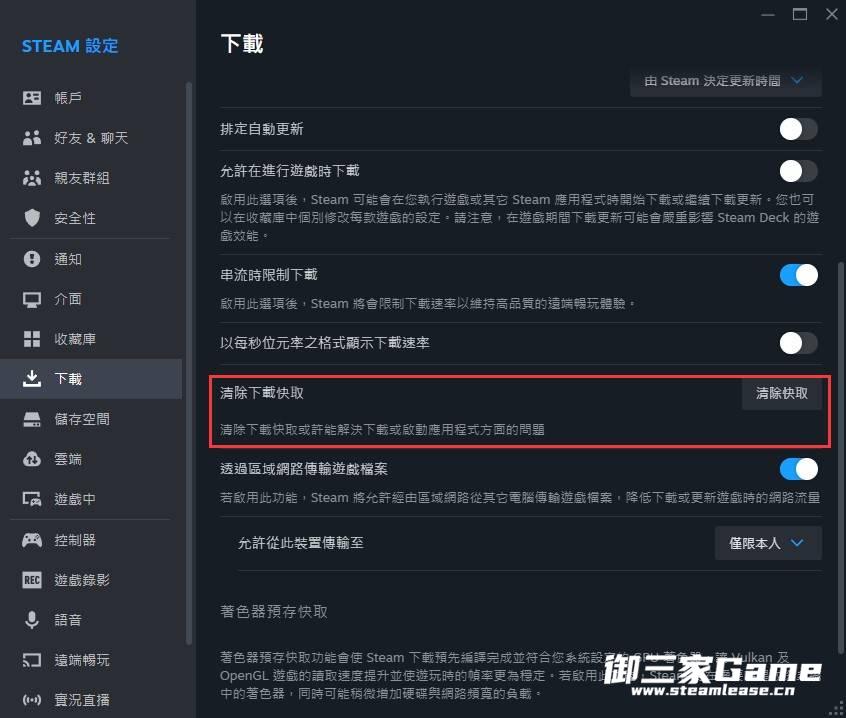 Steam左上角的设置选项-下载-清除下载缓存。