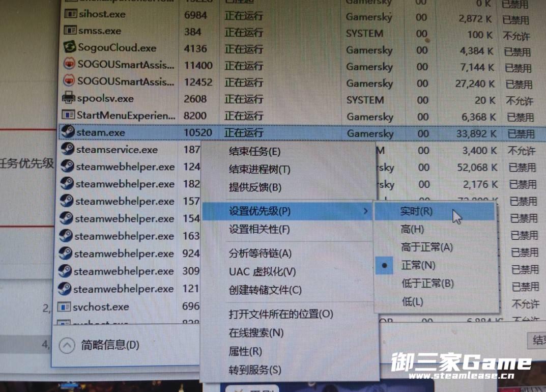 找到Steam.exe,右键设置任务优先级,选择实时,这样解压就快了。