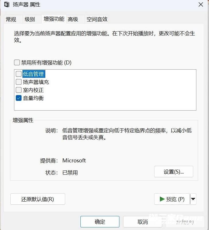 并且如果觉得震动小,可以打开扬声器属性,尝试增强功能中选择音量均衡