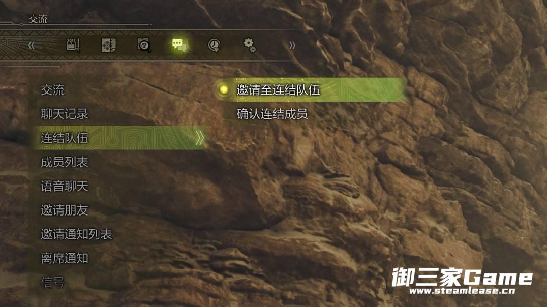 您可以通过选项键开始菜单 > 交流 > 连结队伍 > 邀请加入连结队伍来邀请其他玩家以组成连结队伍。