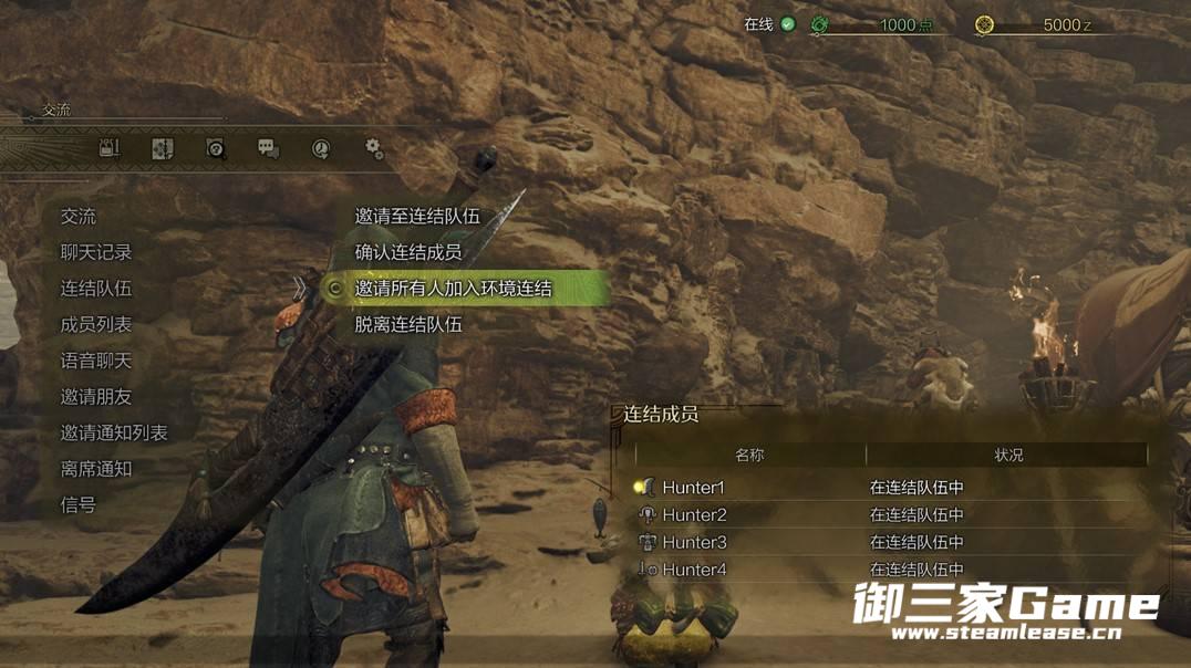 您可以通过“选项键开始菜单 > 交流 > 连结队伍 > 邀请所有人加入环境连结”来邀请连结成员,一起在同一环境内享受原野探索。