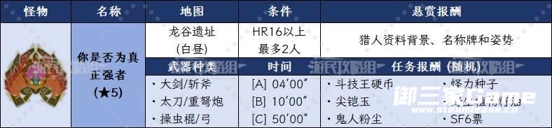 「你是否为真正强者」与普通的斗技大会任务不同,只能以豪鬼形态进行单人挑战,具有单独的排行榜。