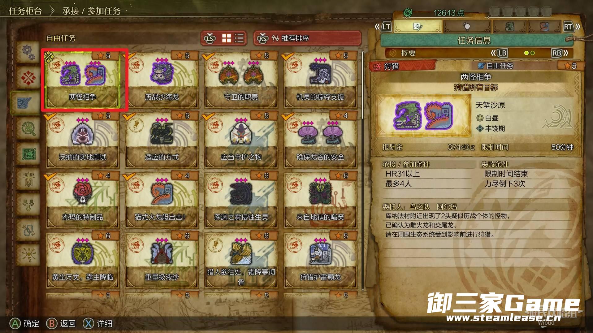 纯粹的战斗任务,找阿尔玛进入自由任务,选择两怪相争并依次狩猎雌火龙与炎尾龙即可。