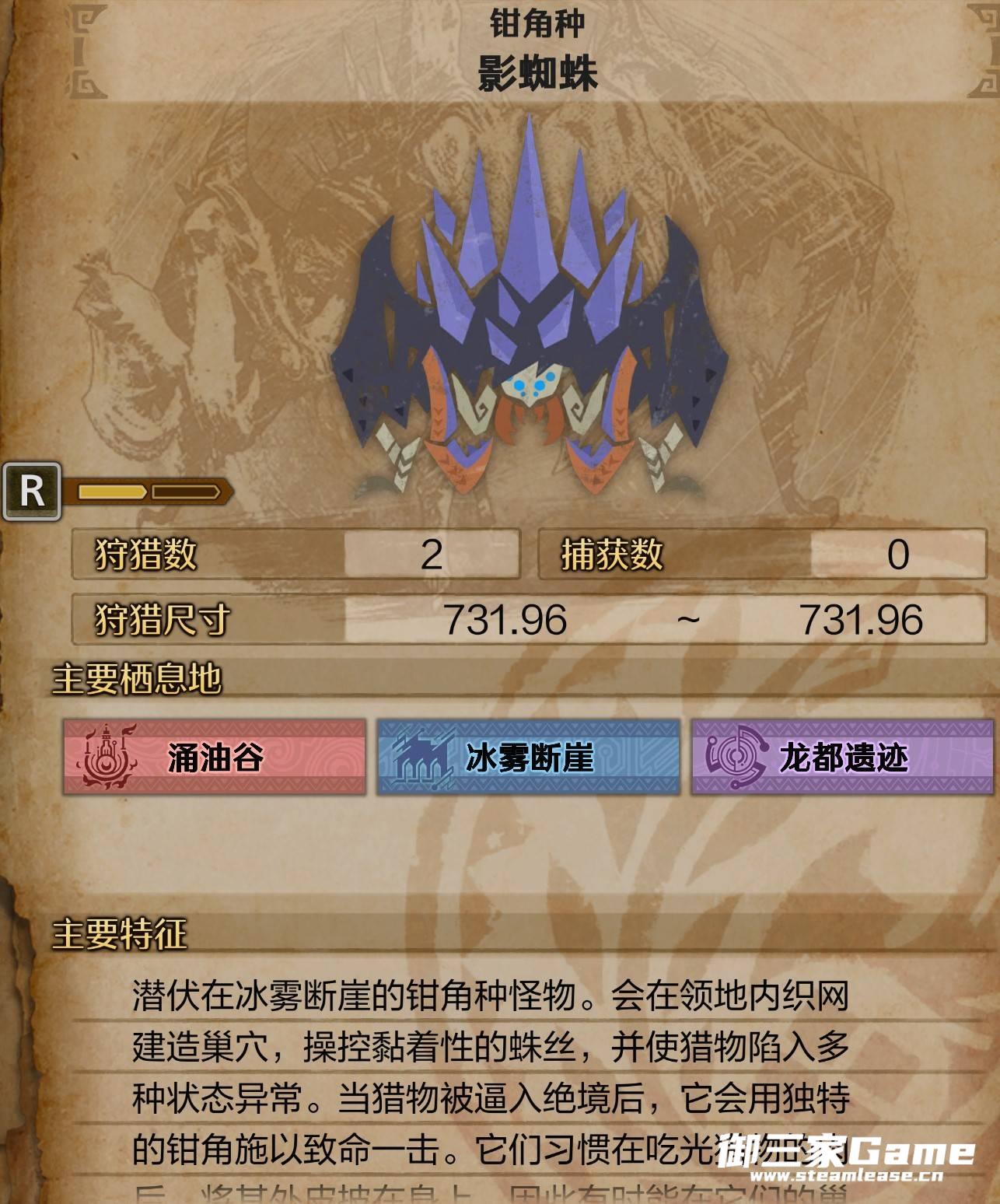 《怪物猎人荒野》中有着不少的大型怪物,影蜘蛛就是其中之一,那么影蜘蛛都有哪些特征呢?下面请看为大家带来的《怪物猎人荒野》影蜘蛛怪物介绍,希望对大家有所帮助。