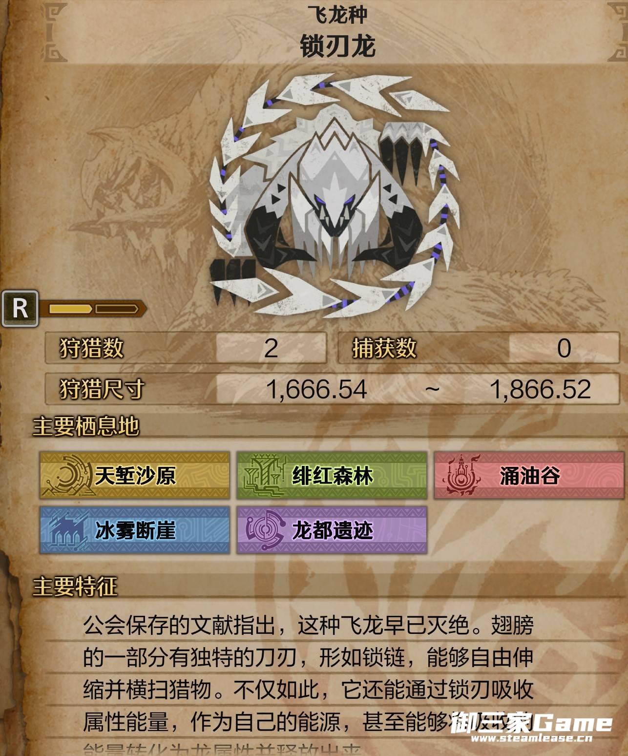 《怪物猎人荒野》锁刃龙游戏中的大型飞龙种,那么锁刃龙一般都栖息在哪里,又有什么特征呢?下面请看为大家带来的《怪物猎人荒野》锁刃龙怪物介绍,希望可以帮助到大家。