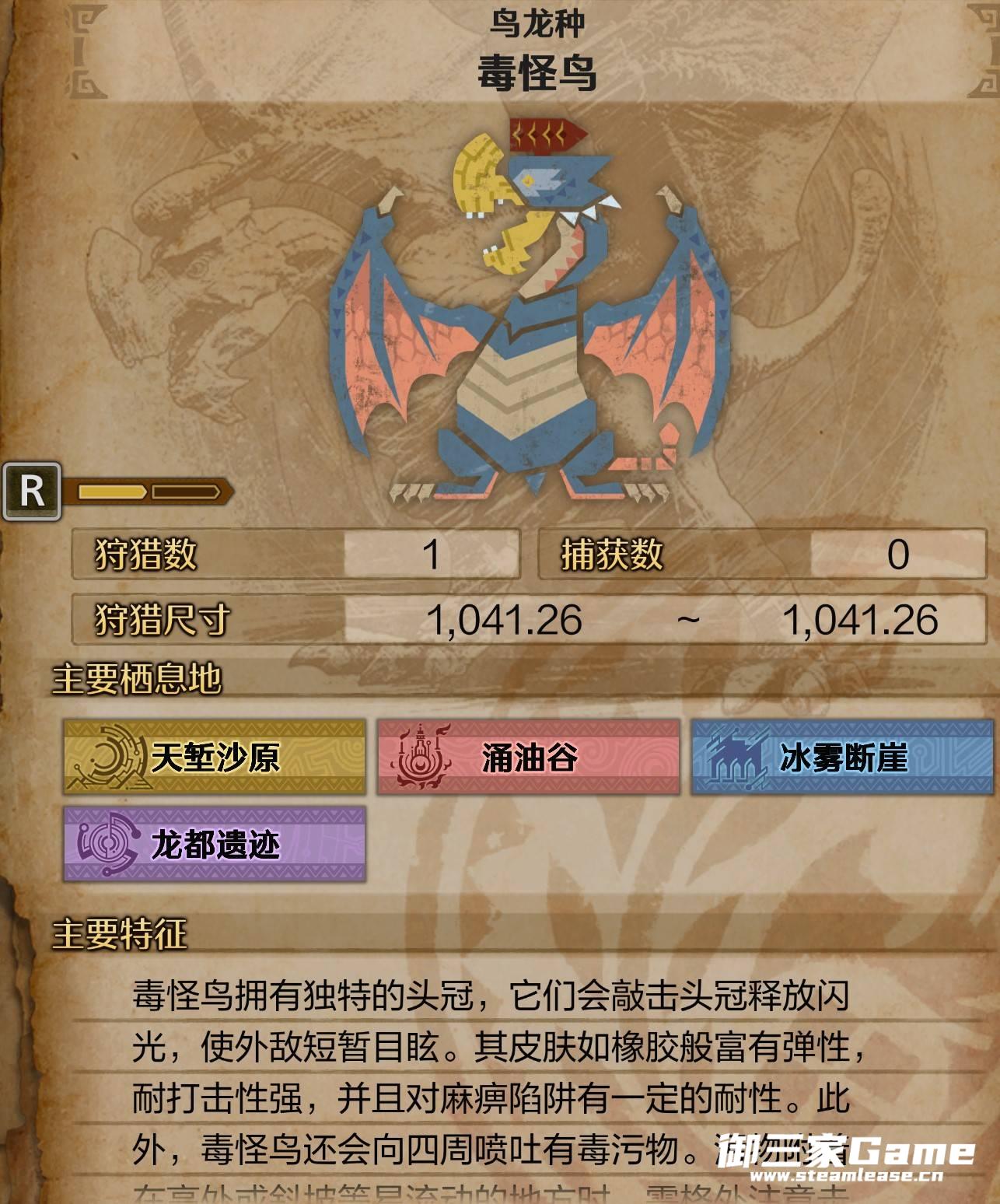 《怪物猎人荒野》毒怪鸟是游戏中的一种大型怪物,还不清楚毒怪鸟主要栖息地与特征的玩家下面请看《怪物猎人荒野》毒怪鸟怪物介绍,希望可以帮助到大家。