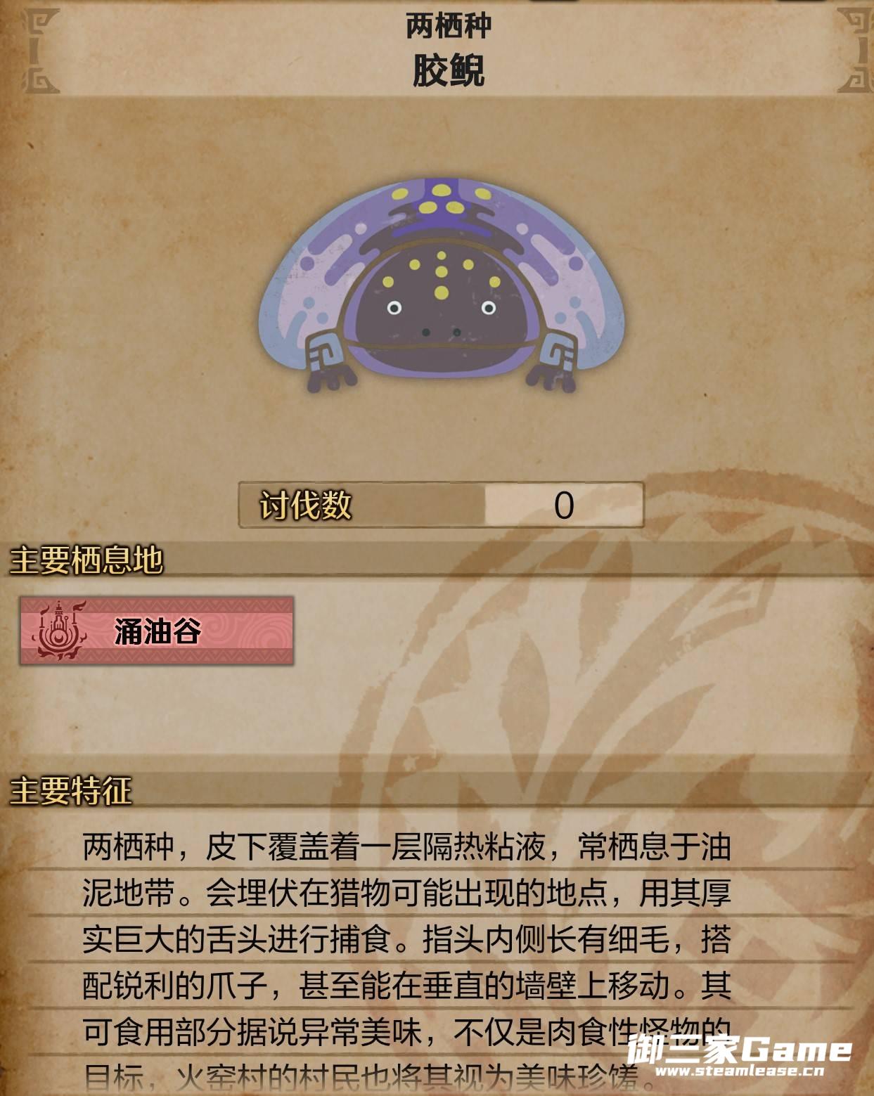 《怪物猎人荒野》胶鲵是游戏中的小型怪物,还不清楚胶鲵主要栖息地与特征的玩家下面请看《怪物猎人荒野》胶鲵怪物介绍,希望能够帮助到大家。