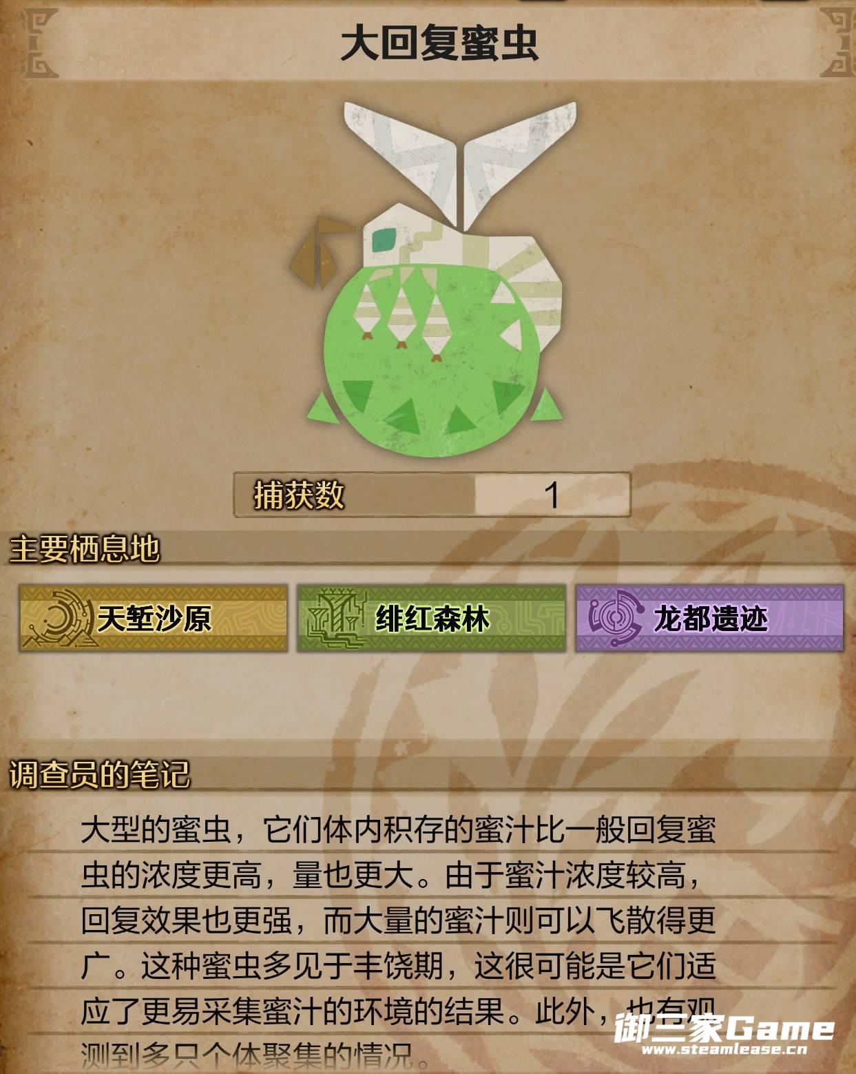 《怪物猎人荒野》大回复蜜虫相比回复蜜虫可以存放更多的蜜汁,那么大回复蜜虫的主要栖息地与习性都有哪些呢?下面为大家带来《怪物猎人荒野》大回复蜜虫生物介绍,希望可以帮助到大家。