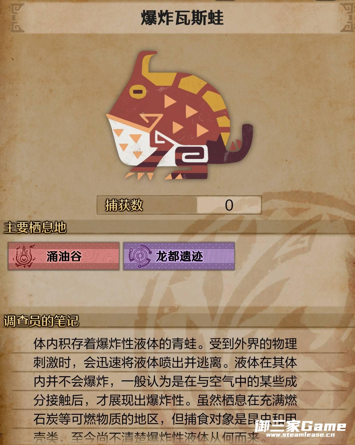 《怪物猎人荒野》中不同的生态环境中生存着各式各样的生物,其中爆炸瓦斯蛙这种生物的主要栖息地在哪里呢?下面请看《怪物猎人荒野》爆炸瓦斯蛙生物介绍,希望可以帮助到大家。
