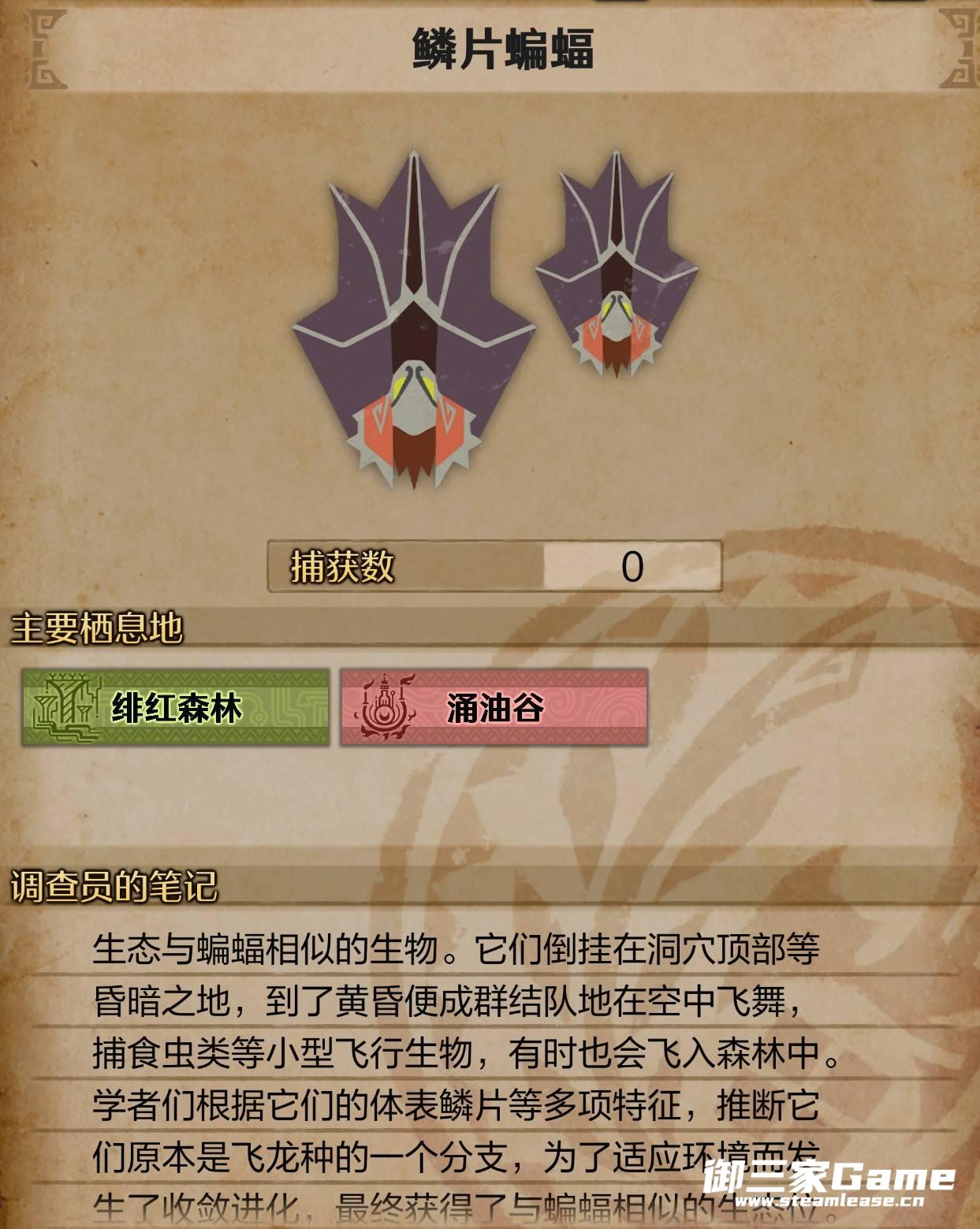 《怪物猎人荒野》中有着许多的可飞行生物,鳞片蝙蝠就是其中之一,那么鳞片蝙蝠有哪些生活习性呢?下面为大家带来《怪物猎人荒野》鳞片蝙蝠生物介绍,希望可以帮助到大家。