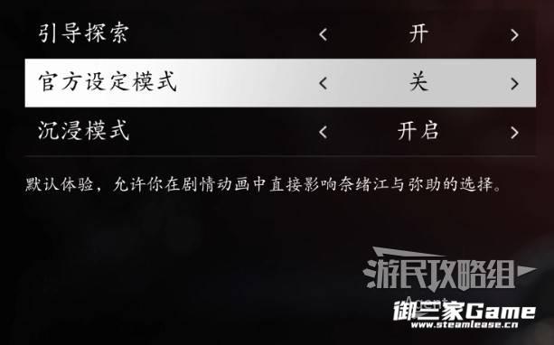 官方设定模式:开启后,将移除剧情中的所有对话选项,主角的对话以官方默认设定为准,懒得做选择的话就开启。个人建议关闭,有些对话选项自己选会更有参与感,关键的地方可以自己来做抉择,比如恋爱剧情。注意这个选项进入游戏后无法再更改。