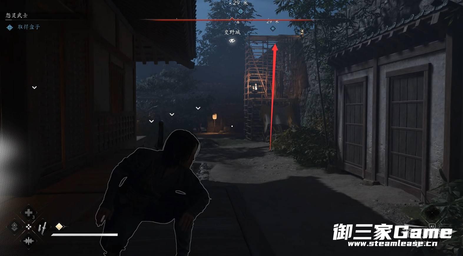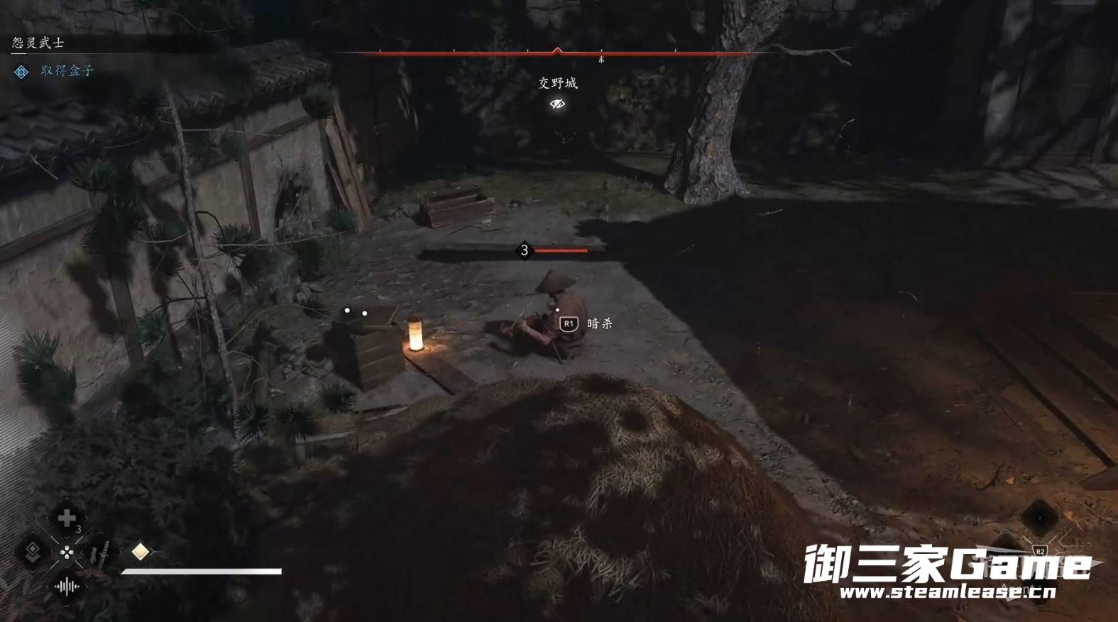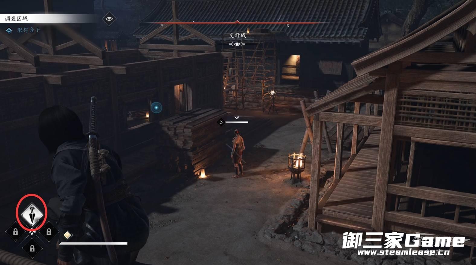 扔苦无(飞镖)熄灭灯火,在黑暗中潜行敌人就很难发现你。