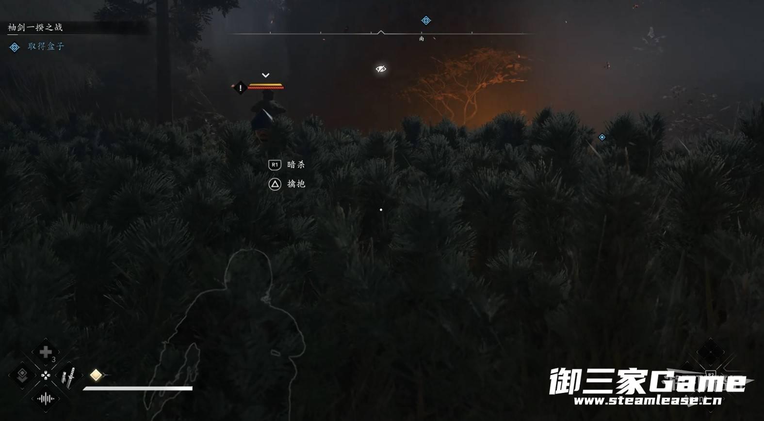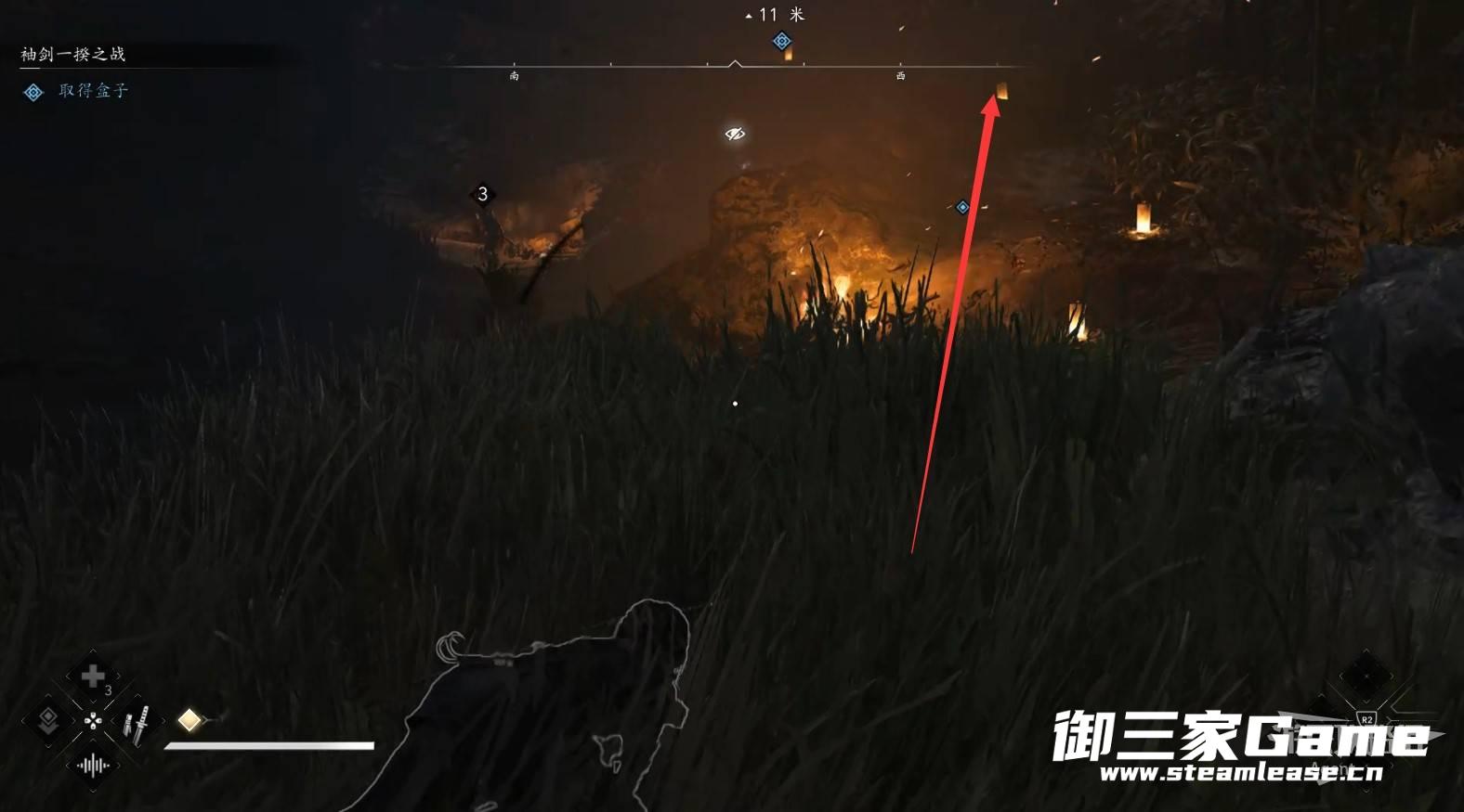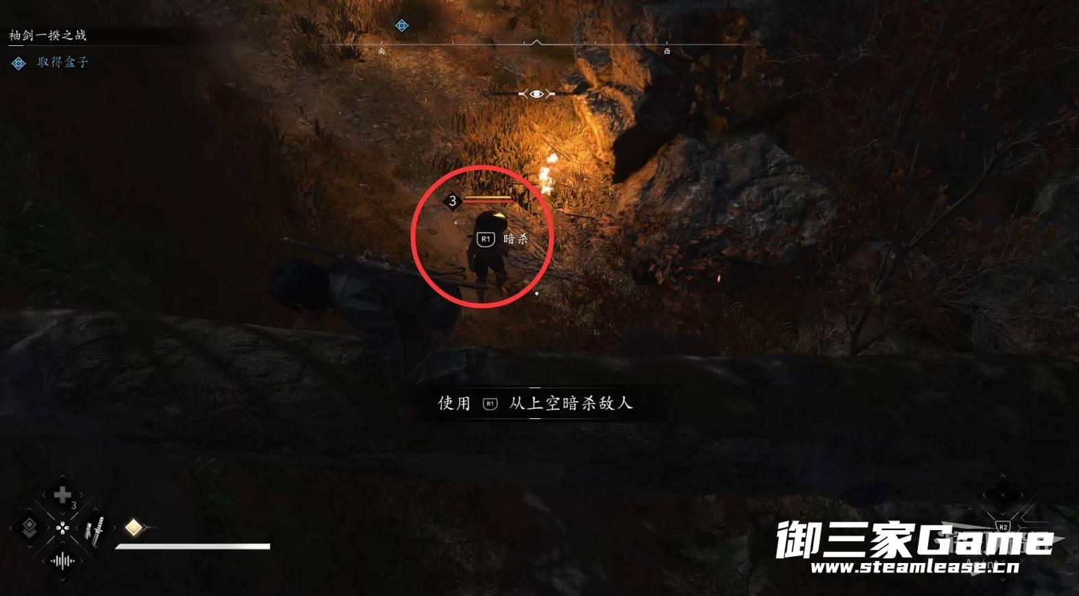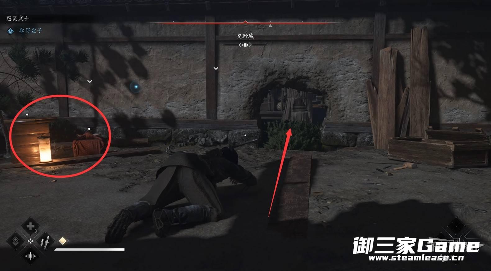 扔苦无(飞镖)熄灭灯火,在黑暗中潜行敌人就很难发现你。