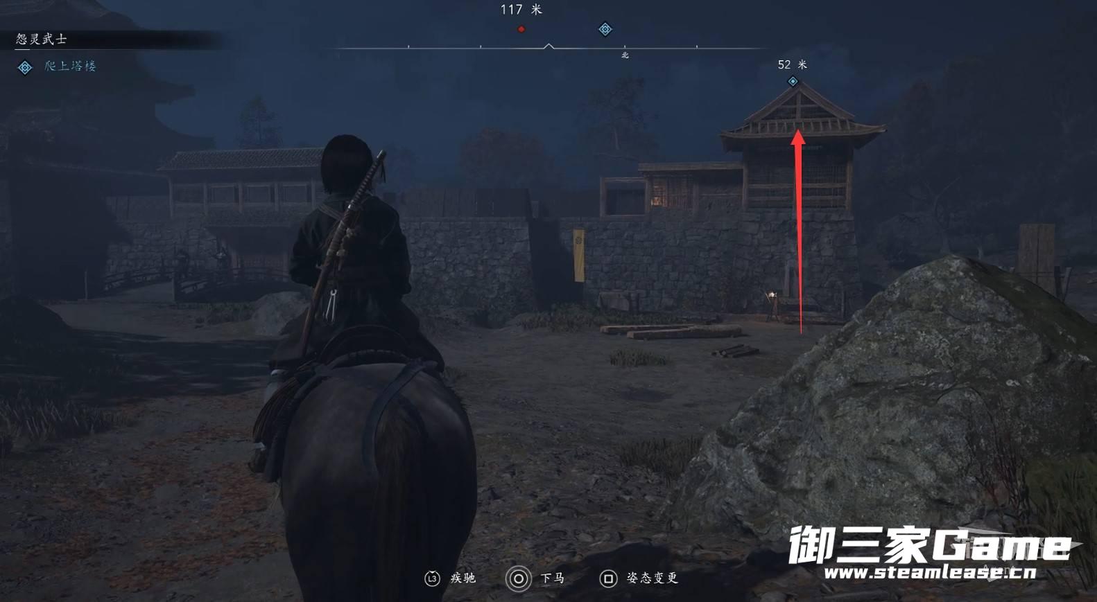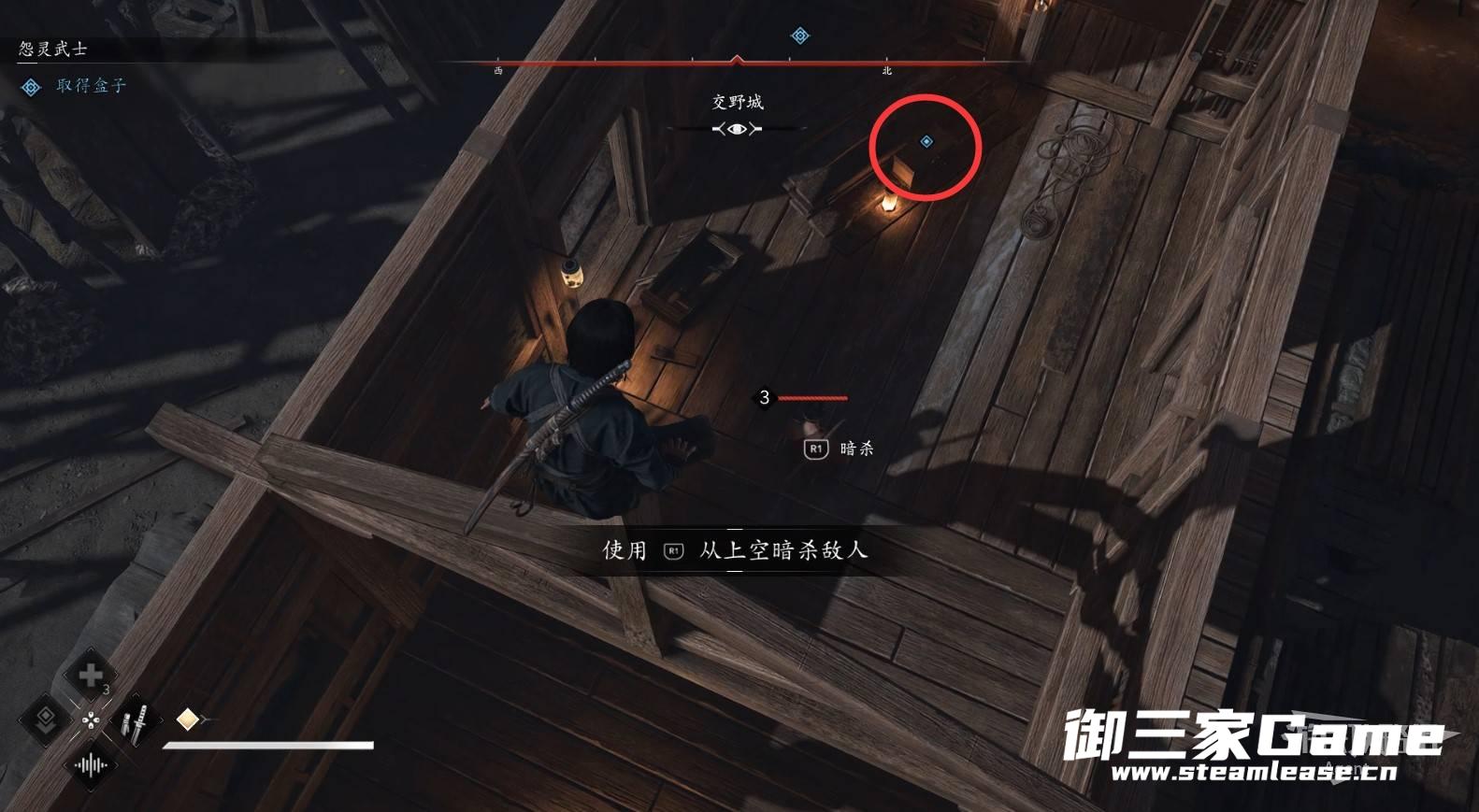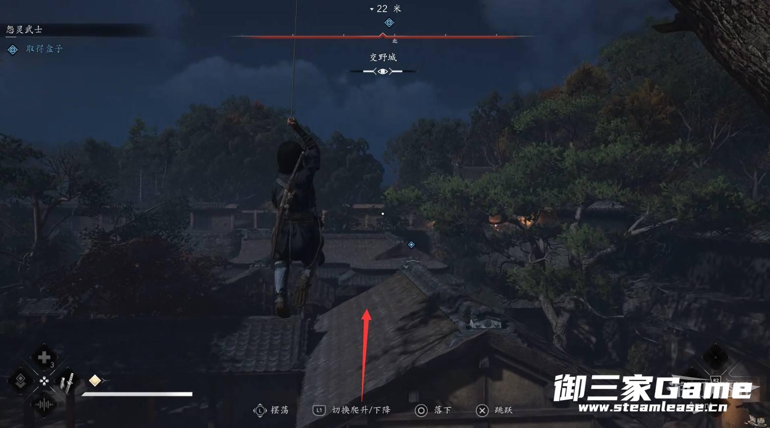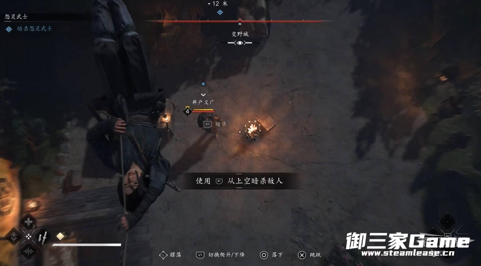 终于找到抢你盒子的井户义广,使用钩绳荡过去然后从空中暗杀,然后逃出城触发剧情。
