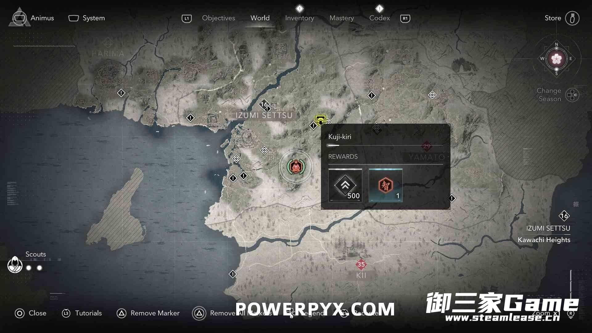 九字真言是奈绪江的专属收集要素,无法在扮演弥助时收集。九字真言在地图上会以白色问号标记显示,靠近时就会变成橙色的九字真言图标,是一种按键QTE小游戏,需要正确按下对应按键并进行冥想才能完成收集,可获得知识点和经验值。注意其中有一个九字真言会有一个40级的小怪偷袭。如果是以弥助的身份前往的话,可以在物品栏按住【□键/X键】来切换成奈绪江再进行收集。