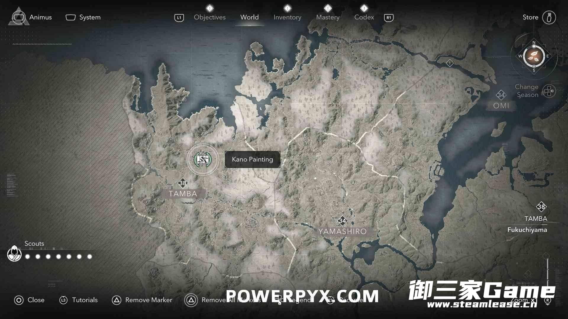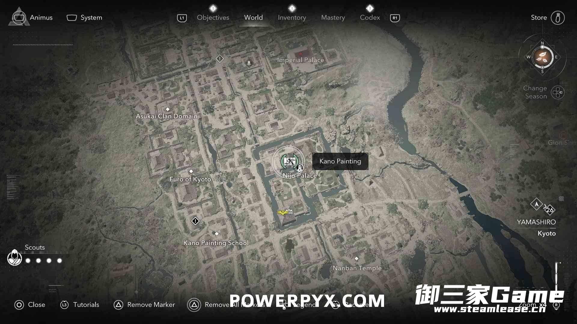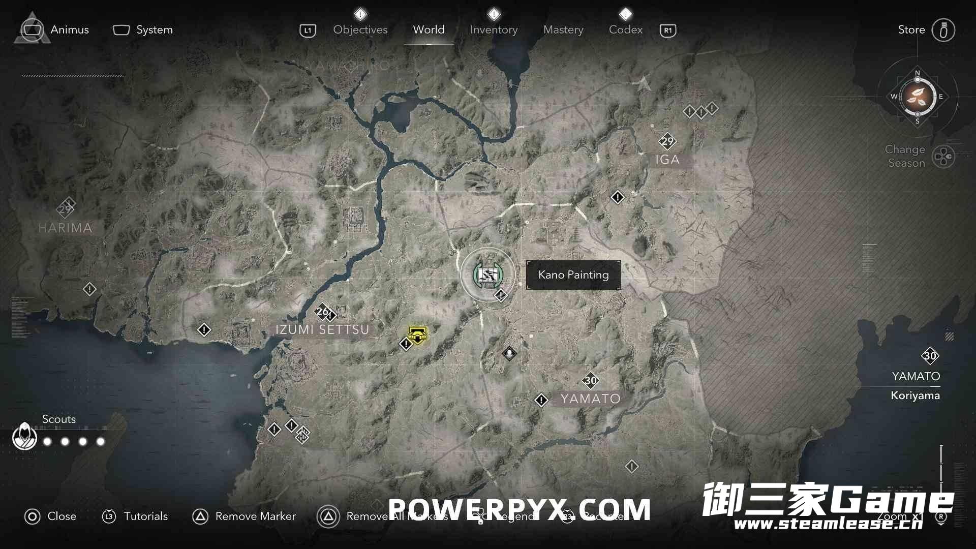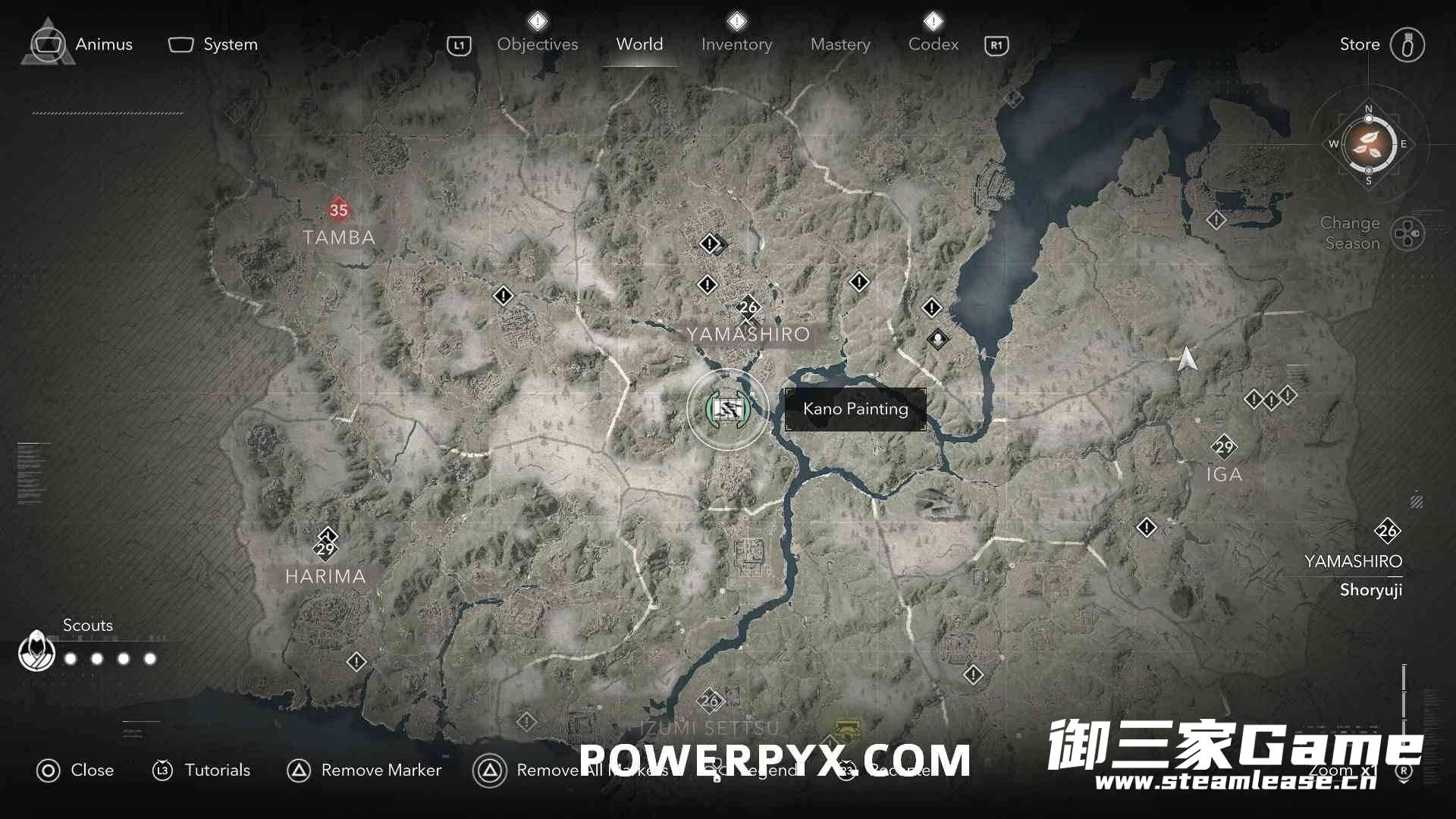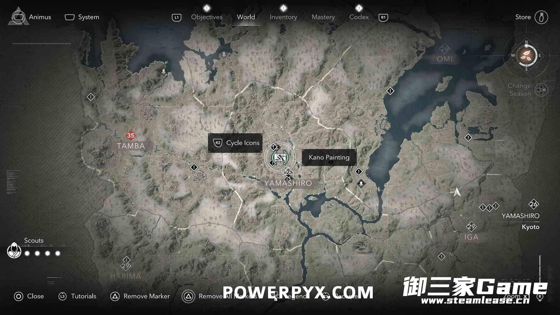 狩野派画作是山城支线任务艺术收藏家所需的任务道具,也是本作中的收集要素之一。此任务会跟随主线剧情推进自动触发,并且会在地图上显示“!”标记。狩野派画作可以在城池内找到,完成所有城的探索时可以自动获得。角色靠近狩野派画作所在位置时地图上会出现一个白色的画作图标标记,只有在地图完全放大时才会显示,也可以按触摸板在地图上筛选显示。