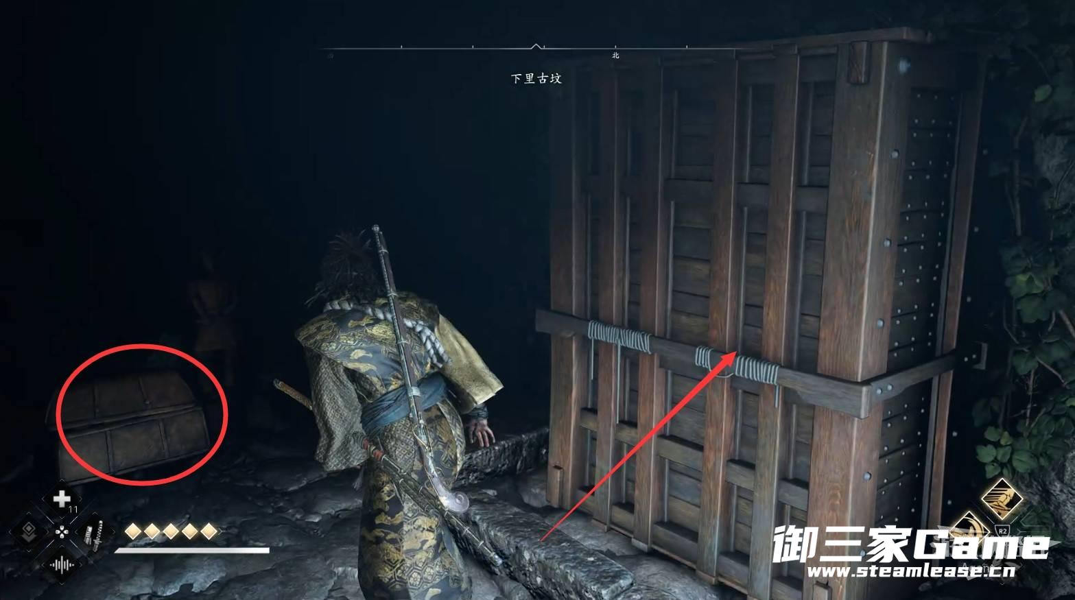 入口处有个小宝箱,使用弥助移开柜子进去。
