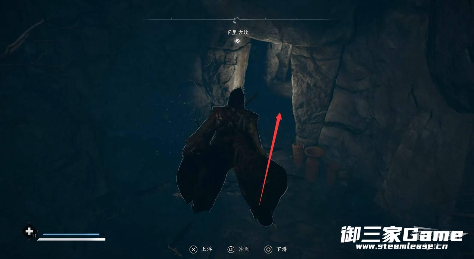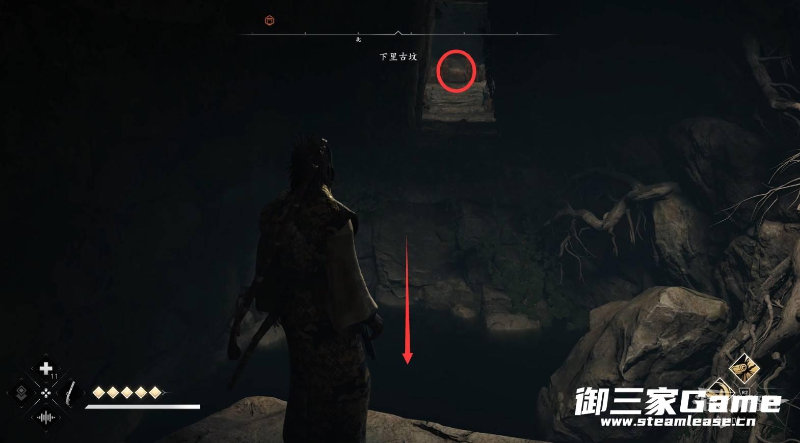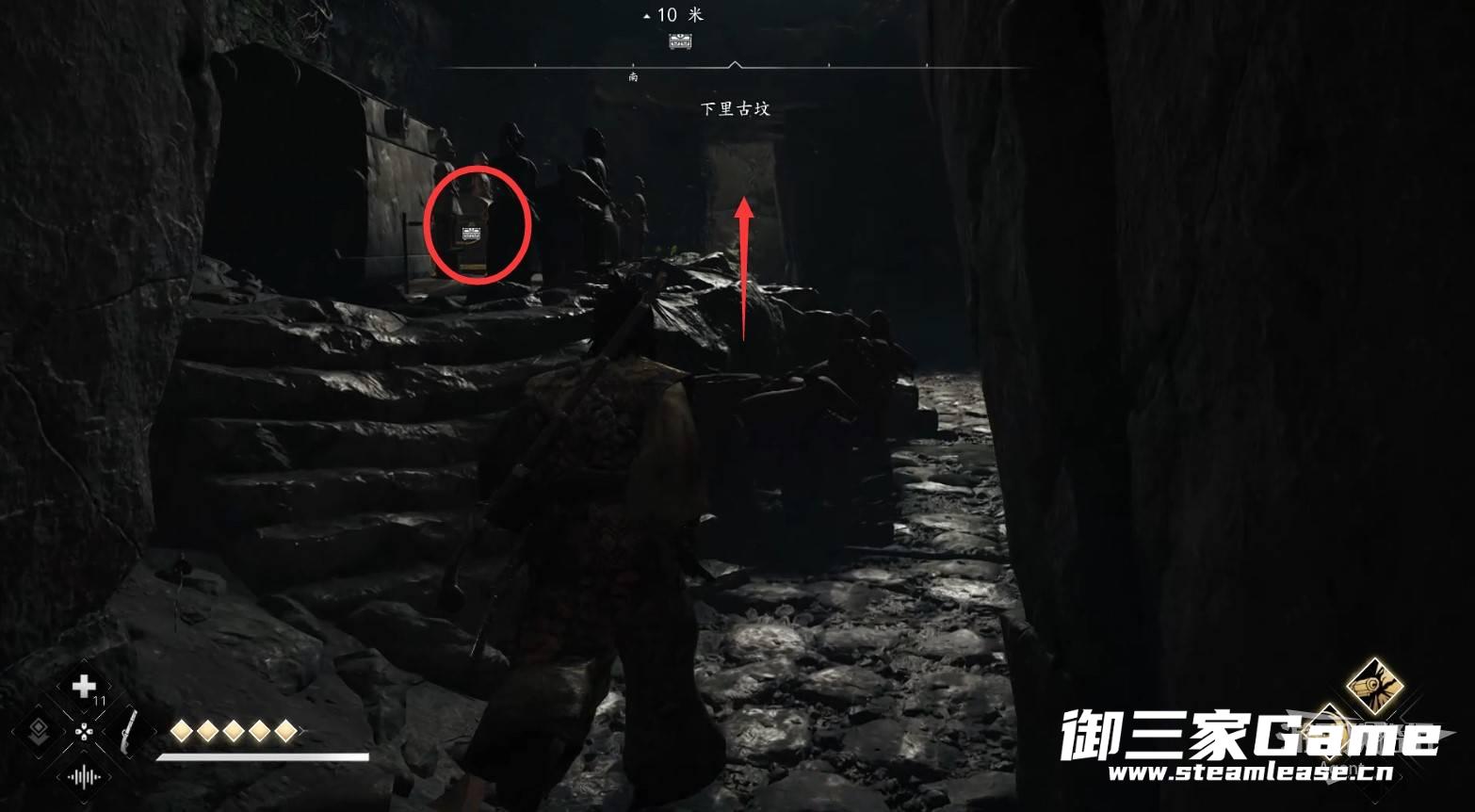 水池对面的路走到头,从洞口可以看到传奇宝箱,但暂时还拿不到。