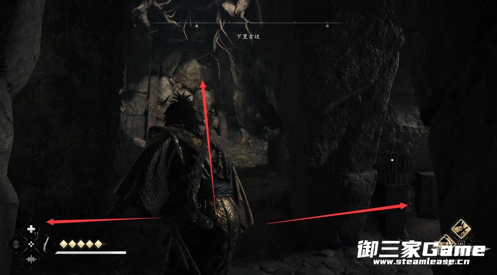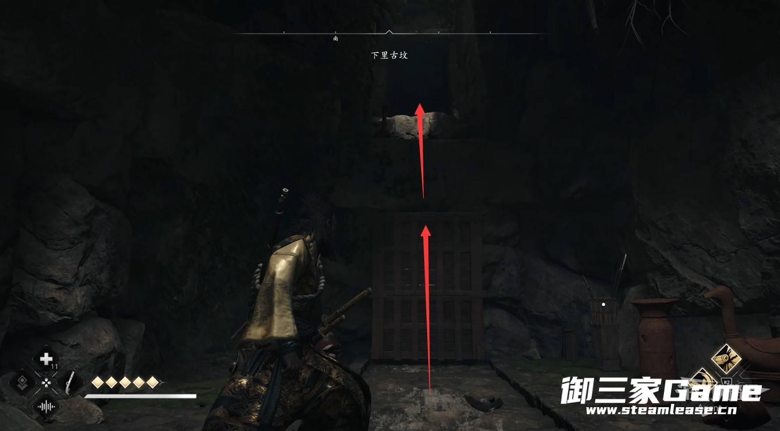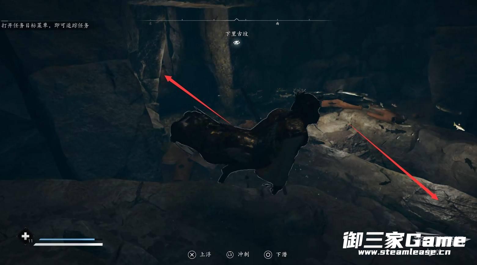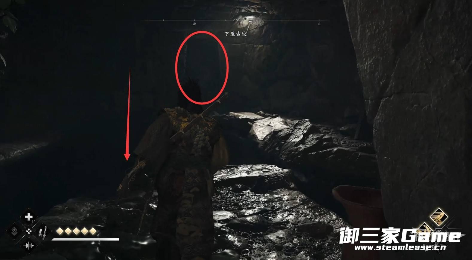 水池对面的路走到头,从洞口可以看到传奇宝箱,但暂时还拿不到。