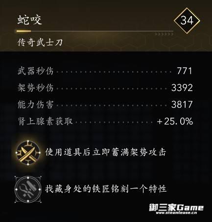 《刺客信条影》蛇咬是游戏中的一把传奇武士刀,那么这把武器的外观是怎样的,以及具体数据又如何呢?下面请看为大家带来的《刺客信条影》蛇咬武器外观与数据一览,希望对大家有用。