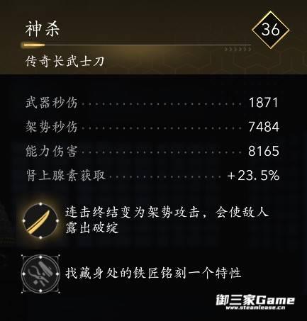 《刺客信条影》中神杀是一把传奇长武士刀,还有玩家不清楚这把传奇武器的数据如何,下面就来看看为大家带来的《刺客信条影》神杀武器外观与数据一览吧!