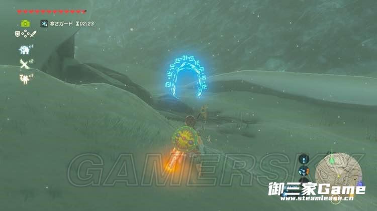 第二个地方在山顶旁边下面,里面还有个被冰柱盖住的祠堂,看到这个蓝光圈就是了,然后起跳按ZL再按A可以用盾牌滑雪,规定时间追上光圈就好