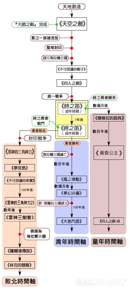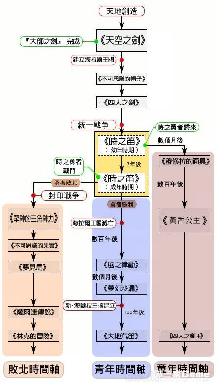 新公布的历史时间轴虽然和25周年的《海拉尔史记》大抵相同,都是原始时间轴之后到了<时之笛>分裂成三条不同走向的未来