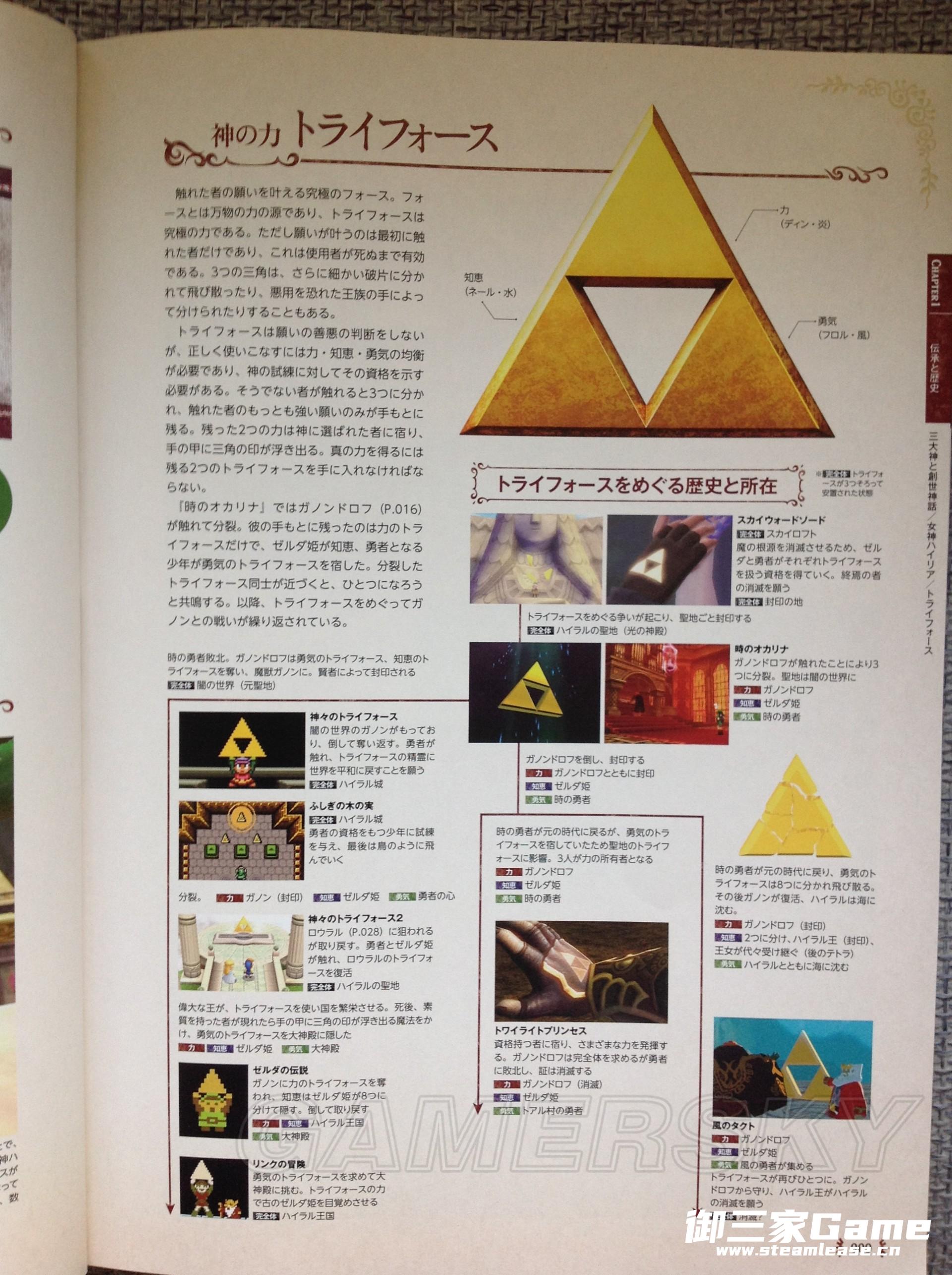 相较于30周年书籍第一册的<塞尔达传说画集>(Hyrule Graphics), 第二册的大百科收录了系列从<初代>到<三剑客>作品中的各种细节内容,并将其分类成百科类型的条目逐一介绍,同时补充了一些细节来完善塞尔达世界观的介绍,就这点来说已经是诚意满满了。
