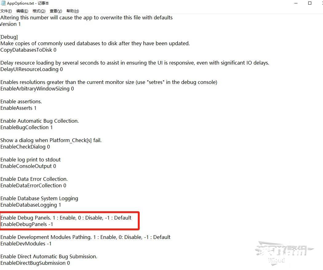 修改前先备份文件,滚动找到“;enable debug panels -1”,将其替换为“enable debug panels 1”(这确保删除代码前面的“;”!)。