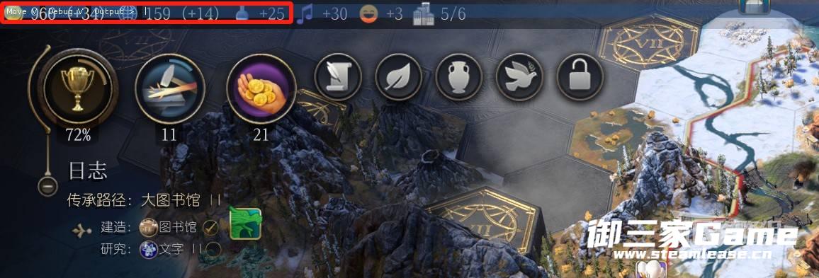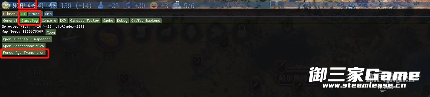 强制结束时代:选择“Debug(调试)”依次点击用户界面(UI)与游戏玩法(Gameplay),点击左下角的“Force Age Transition(强制时代转换)”可强制结束当前时代。