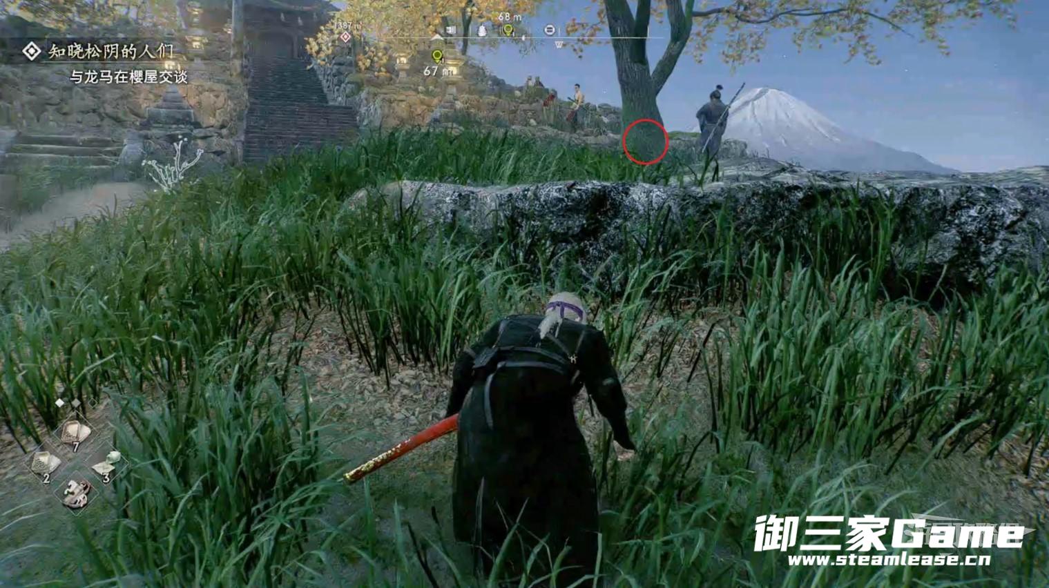 此通缉犯就在下图所示的树后面,位置很好暗杀,如果点了连续暗杀技能的小伙伴可以直接结束战斗。